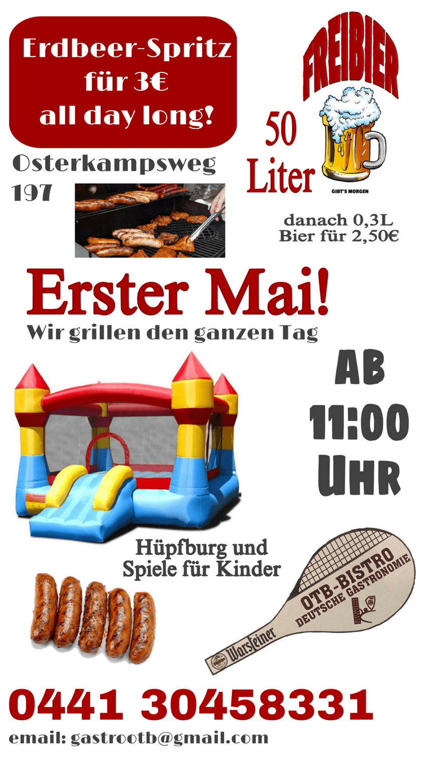 Veranstaltungshinweis: 01. Mai, Maifeier, 1 Fass Freibier, anschl. 2,50 € (0,3l), Erdbeerspritz 3 €, Attraktionen für Kinder wie Hüpfburg uvm.