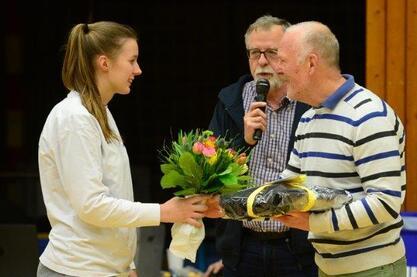 Er hat fünf Jahrzehnte für den OTB hochklassig gespielt, Mannschaften trainiert und gemanagt. Alina Jahnke überreicht einen Blumenstrauß, Vangelis einen Trainingspullover mit "Baskets Akademie Weser- Ems/Oldenburger TB" und Klaus Kertscher spricht die Dankesworte. Foto: Erik Hillmer