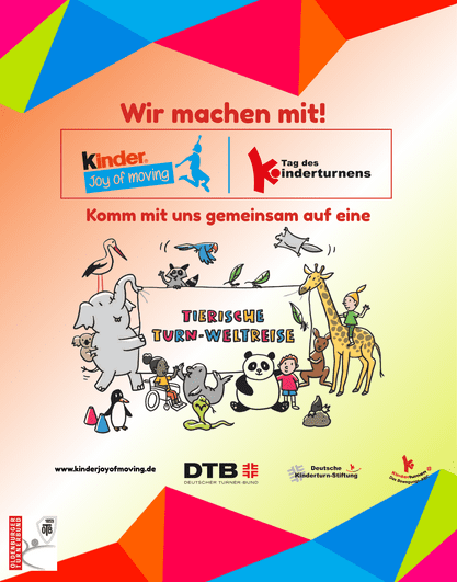 Mit dem bundesweiten Tag des Kinderturnens lädt der Deutsche Turner-Bund in Kooperation mit der Bewegungsinitiative kinder Joy of Moving alle Kinder ein, in die Welt des Kinderturnens reinzuschnuppern. Die Familien erwartet ein spannendes Programm, bei dem Kinder das Kinderturnen ausprobieren können. Am Tag des Kinderturnens beteiligt sich auch der/die Vereinsname am Datum.